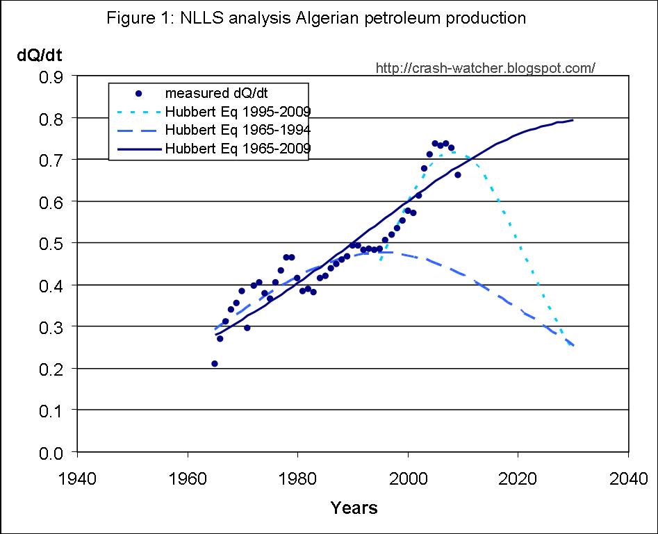 Figure 6 shows the result of such a fit using the Hubbert equation (alternating two short and one long dashes), again using only the data from the sub-period 2001-2009. Also for reference, I put two "Xs" to mark the spots that would correspond to a production rates of 2.5 mbd (0.91 bbs/yr) and 3 mbd (1.095 bbs/yr) in 2012 which is the production range estimated by the EIA.